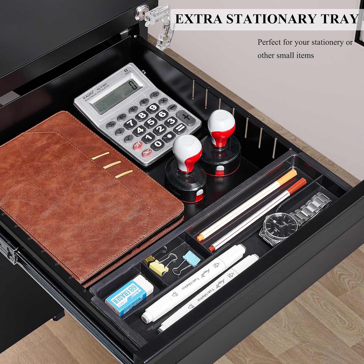 - The 3 drawer locking file cabinet are for your daily files and documents storage.Two stationery drawers and one filing drawer for letter size, legal size and A4 hanging file folders. It comes Fully assembled except the casters.