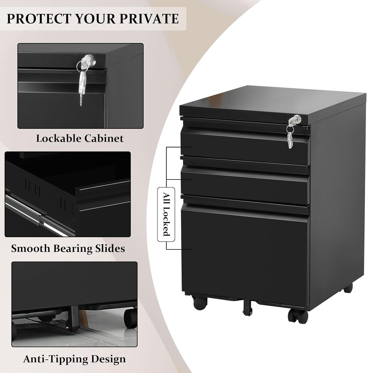 - One key secure all 3 drawer.A key lock (including two keys) will help keep your valuables and files safe when you’re away from your desk