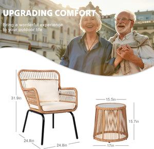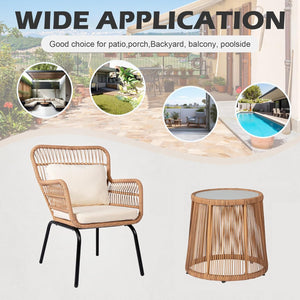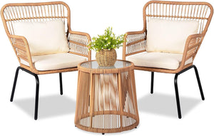 - 【WHATS INCLUDED】 Each 3 pieces bistro conversation set includes 4 overstuffed waterproof zippered cushions, 1 cocktail table with a tempered glass top, and 2 boho style indoor outdoor chairs.