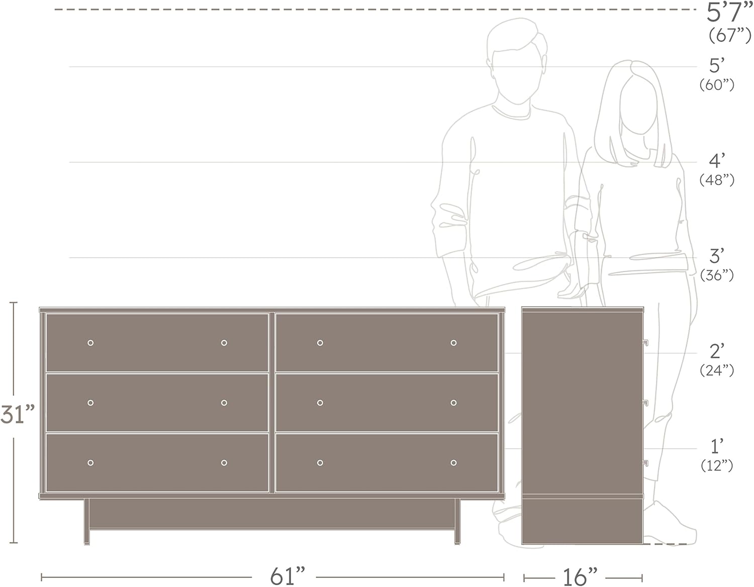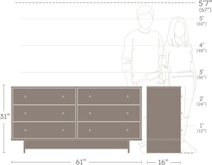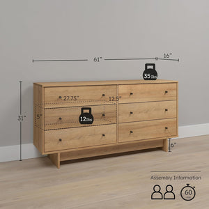 - ASSEMBLED DIMENSIONS & WEIGHT: Natural Oak 6-Drawer Dresser 16" D x 61" W x 31" H, Total weight- 128.00 lbs., All pieces arrive ready to assemble in 1 Box.