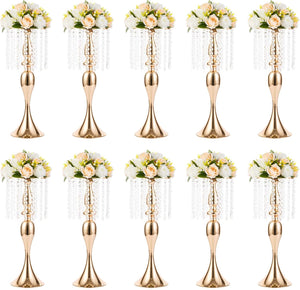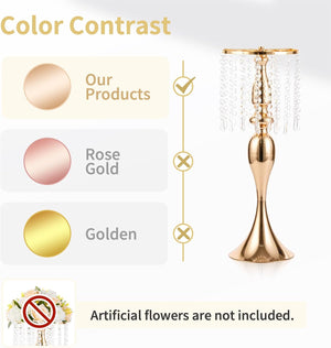 - FRIENDLY REMINDER: The color is some kind between gold and rose gold. Due to the light and screen difference, the item's color may be slightly different from the pictures. PACKAGE INCLUDES: 10 pcs 21.3 inches (54cm) height centerpieces wedding flower holder for wedding and events. The top round plate diameter is 7.9"/ 20cm wide. Artificial flower are not included. Perfect for a housewarming or wedding present.