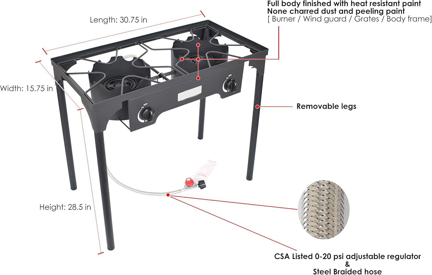 - SUPER HEAVY DUTY POWER – Super power comes by 2 super heavy duty burner, The 2 powerful burners can output max.120,000 total BTU/hr, for 60,000 BTU each with 20 PSI