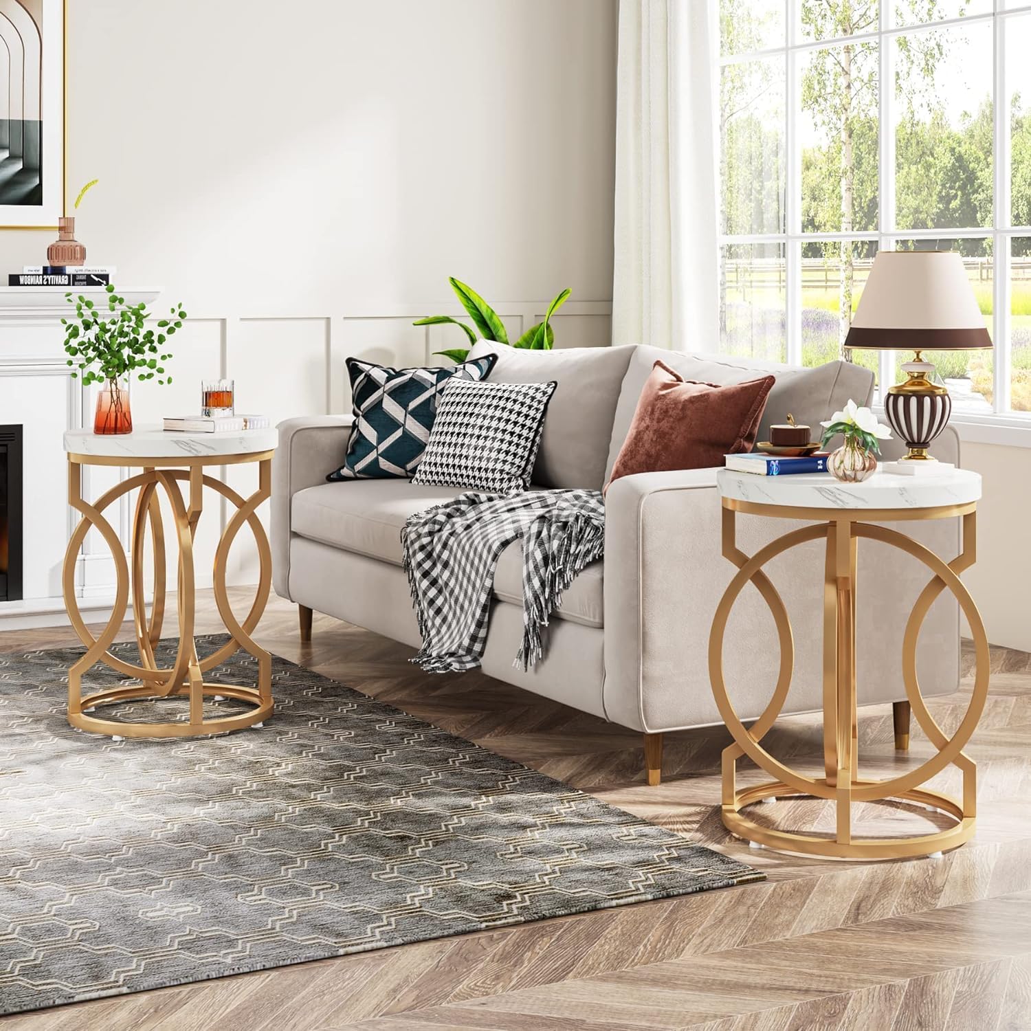 - 𝐒𝐩𝐚𝐜𝐢𝐨𝐮𝐬 𝐚𝐧𝐝 𝐏𝐫𝐚𝐜𝐭𝐢𝐜𝐚𝐥: With a 19.7-inch diameter tabletop, this white gold circle side table provides ample space for all your living room essentials. Keep everything organized and within reach, from coffee cups to lamps and tissue boxes