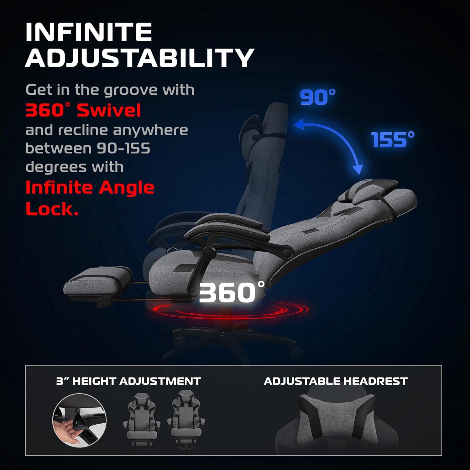 - Customize Your Comfort: Adjust the 155-degree reclining backrest, height, and tilt to find your ideal position. The linked armrests offer support while reclining. Perfect for gaming, working, or relaxing, ensuring hours of personalized comfort.