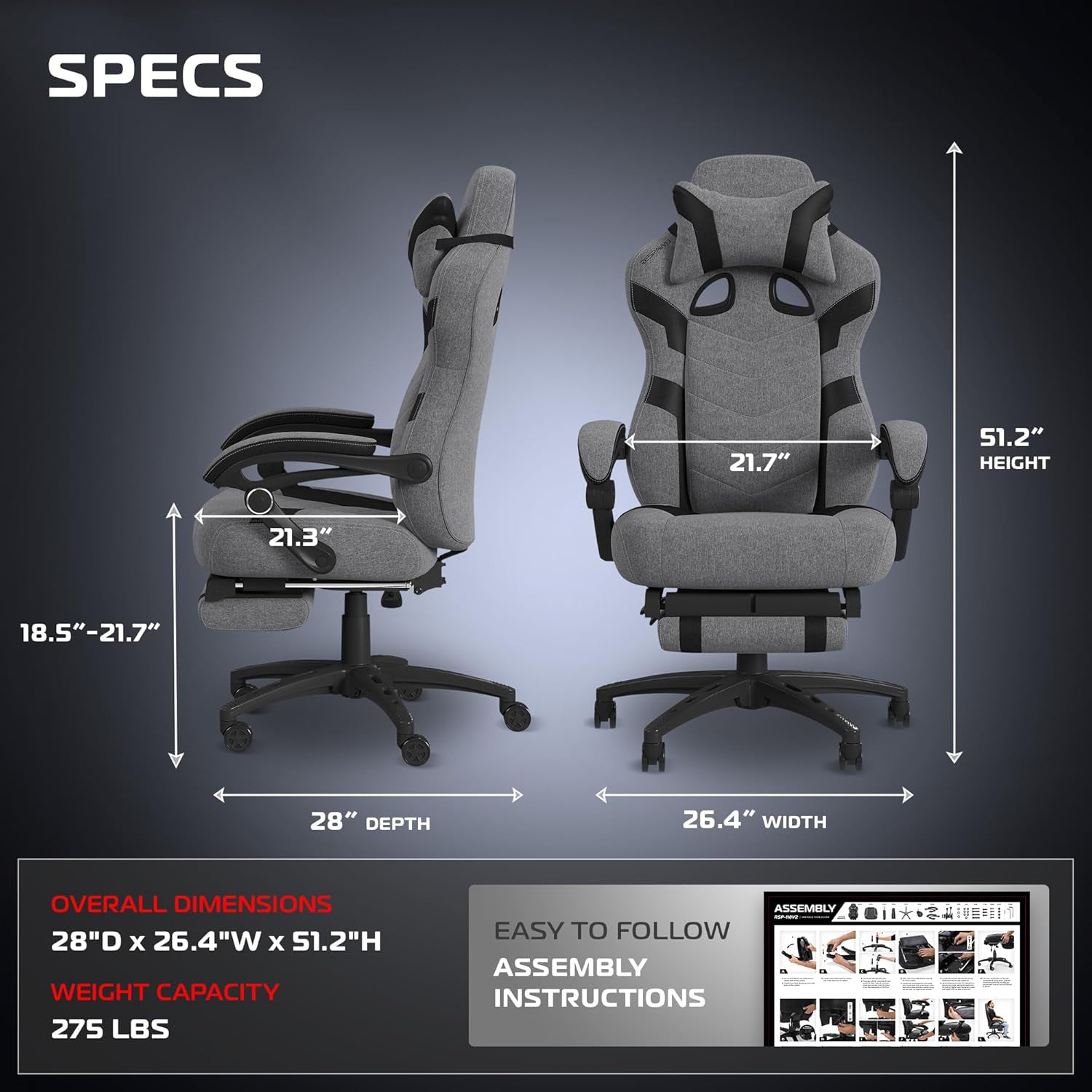 Pro Gaming Chair - Gaming Chair with Footrest, Reclining Gaming Chair, Video Gaming Computer Desk Chair, Adjustable Desk Chair, Gaming Chairs for Adults with Headrest Pillow - Grey Fabric