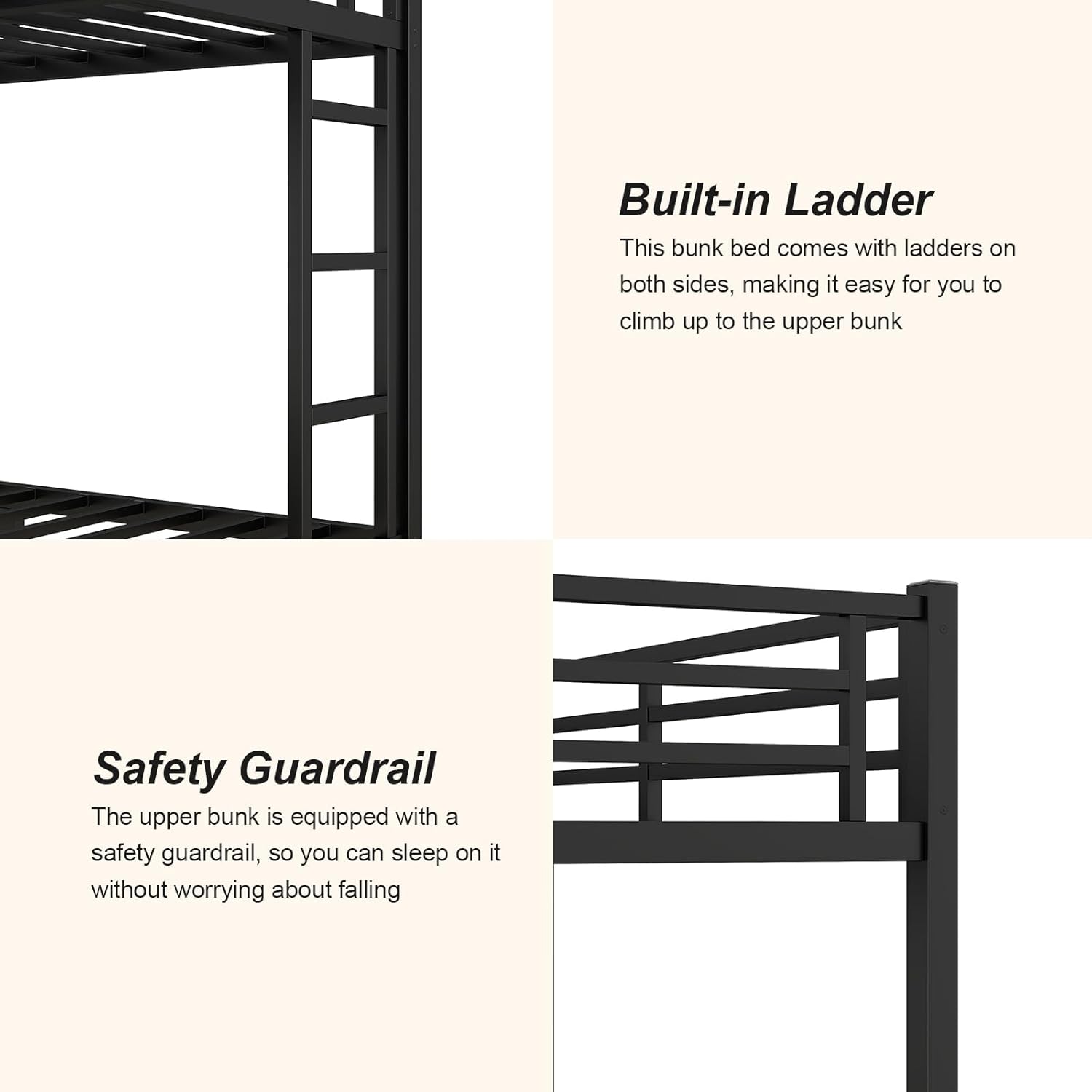 Queen Over Queen Bunk Bed, Metal Bunk Bed Frame Heavy Duty Bunk Beds Loft Bed Frame with Ladder and Guardrail Metal Slats