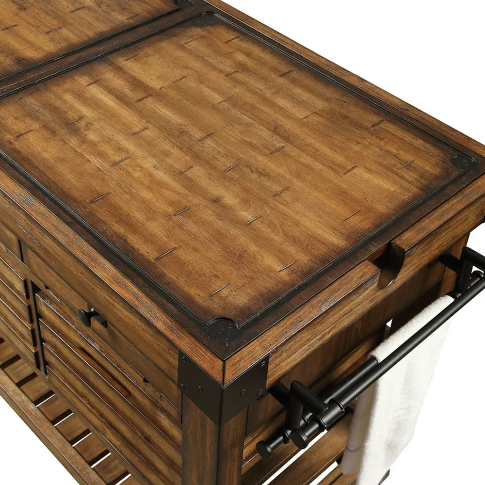 - This cart features a towel rack and oversized locking casters, allowing for easy mobility within the kitchen while ensuring safety during use.